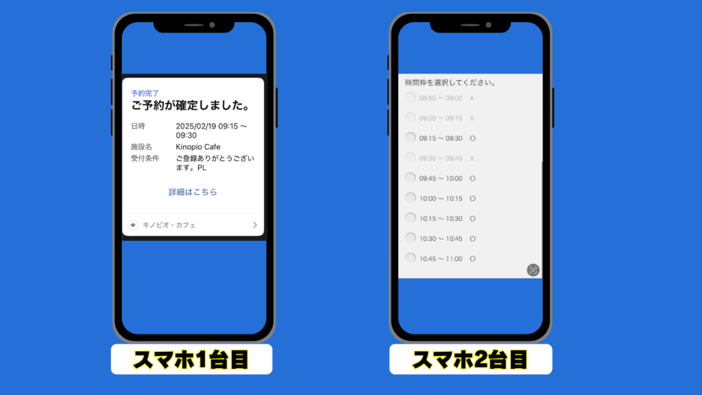 「スマホ2台を使って整理券を取得し、より良い時間を選んでキャンセルする流れ」